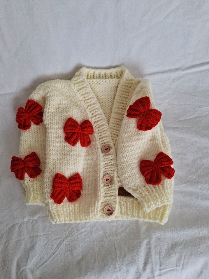 Kız Çocuk Beyaz Örgü Hırka Kırmızı Fiyonk Detaylı