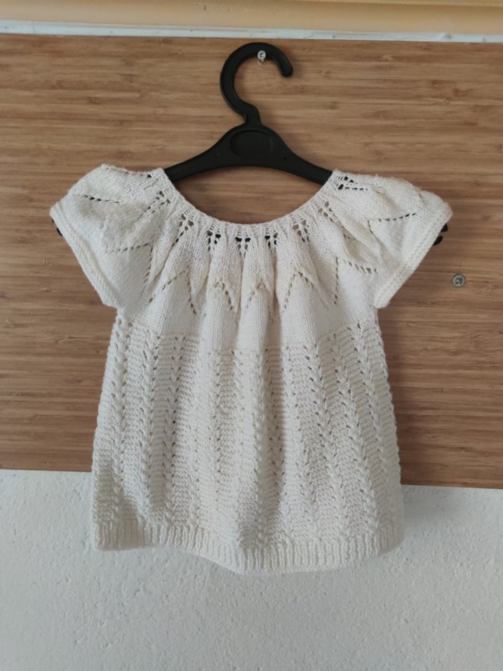 1-2 yaş için uygundur. Kız çocukları için beyaz, örgü kısa kollu, salaş kesim bohem tarzda bluz. Yumuşak dokulu, tek renk ve desenlidir. üst kısım sarı iplikle yapılmış