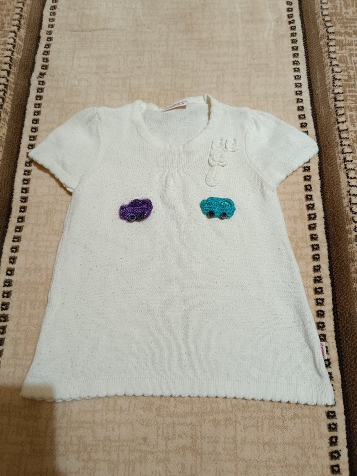 Beyaz renkli, kısa kollu, yuvarlak yakalı kız çocuk örgü tişört. önde örgü ile dikilmiş süs detayları var. ürünün herhangi bir yırtığı, defosu, söküğü yoktur. yalnızca kullanımdan ötürü tiftiklenme vardır. onları temizlediğiniz takdirde yeni gibi bir görüntüye sahip olur.