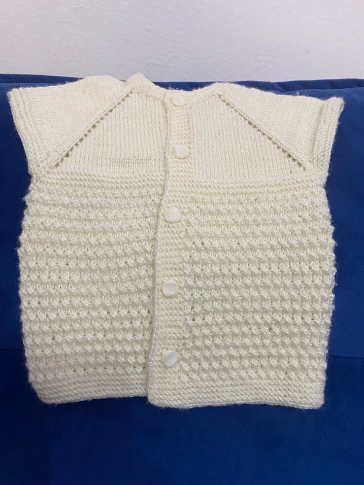 Kız çocuklar için beyaz renkte, kolsuz ve fit kesim bir örgü hırkadır. Düğmeli ve alt kısmı dokulu örgüdesi bulunur.
