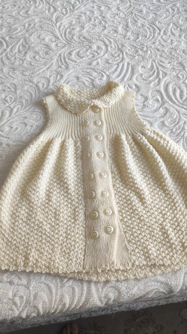 Vintage tarzı, kolsuz, bol kesim kız çocuk hırkası. Yumuşak örme kumaştan, beyaz ve desensiz, önünde çift sıra düğme bulunur.