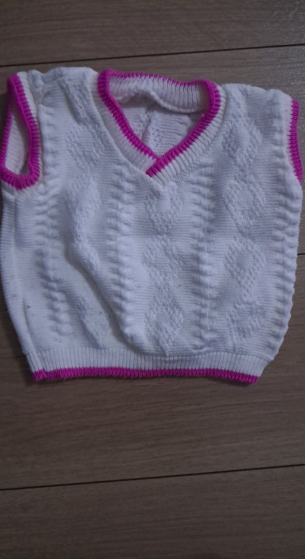 Kız çocuk için beyaz örgü, kolsuz ve fitted kesim süveter. Normcore tarzda, renkli pembe kenar detaylarıyla V yaka.