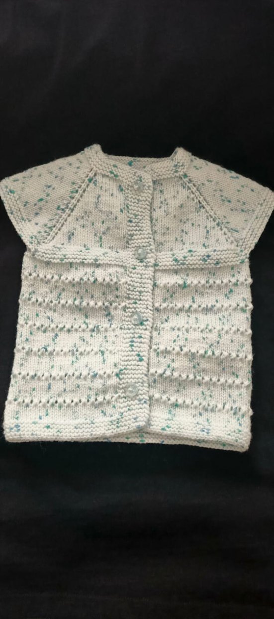 Beyaz ve gri tonlarda, kolsuz ve örgü dokulu kız çocuk hırkasıdır. Bohem tarzda, rahat kesimlidir.