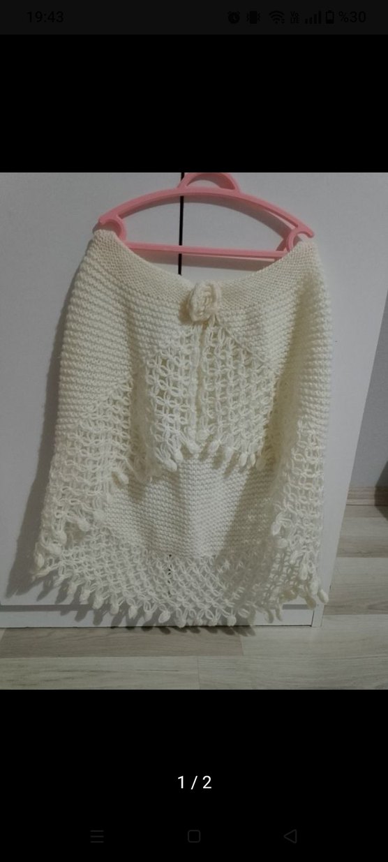 Beyaz örgü kız çocuk panço, salaş kesim ve kayık yaka ile bohem tarzda tasarlanmıştır. Kolsuz ve desen içermeyen, detaylı örgü dokusuna sahiptir.
