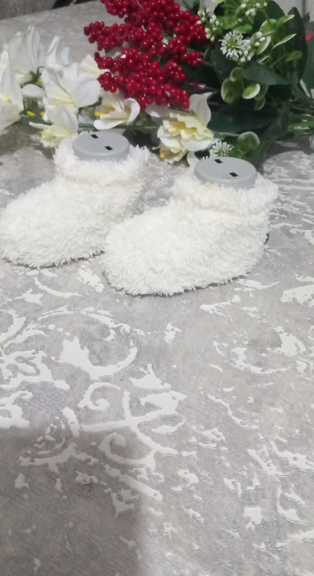 Beyaz örgü kız çocuk terlikleri, yumuşak ve sıcak kumaştan üretilmiştir, rahatlık ve sade bohem tarz sunar.
