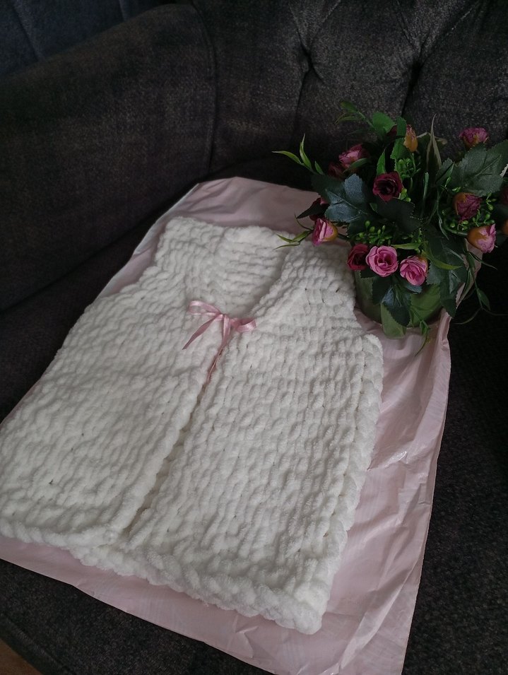 Kız çocukları için beyaz, örgü dokulu, kolsuz süveter. Kayık yaka ve bol kesimlidir. Düz ve desensiz, bohem tarzda bir üründür.