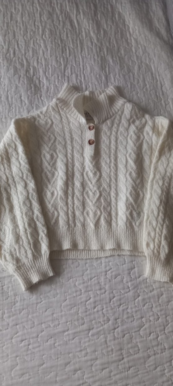 Beyaz örgü triko kazak, yuvarlak yakalı ve uzun kolludur. Bol kesimi ve bohem tarzıyla günlük kullanım için uygundur.