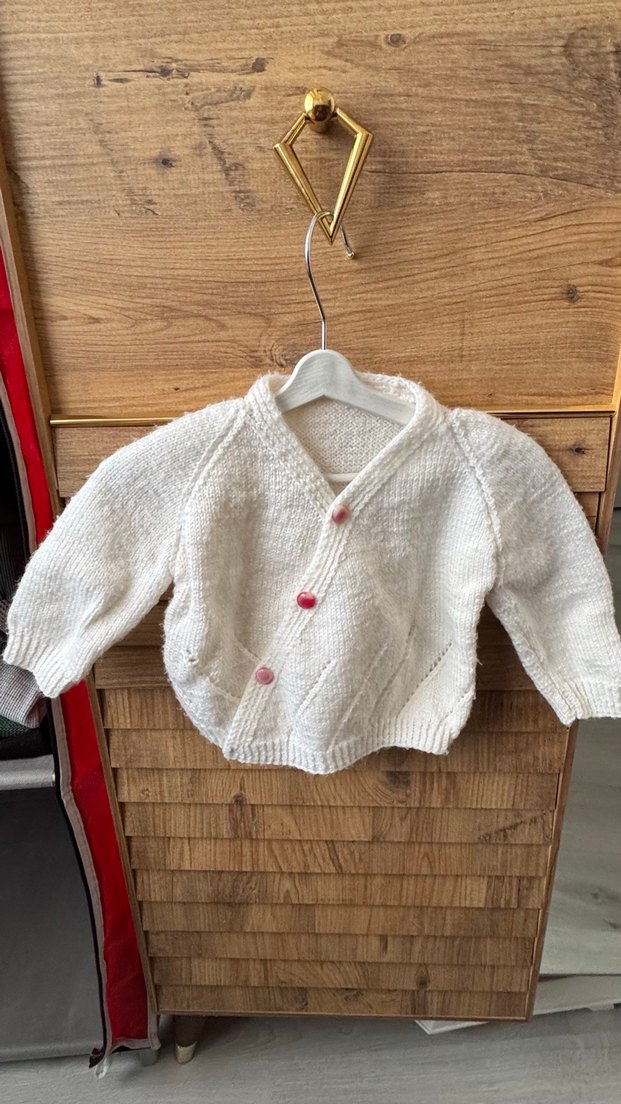 Kız çocukları için beyaz, örgü ve vintage tarzda uzun kollu, bol kesim bir hırka. Üç pembe düğme ile kapatılır.