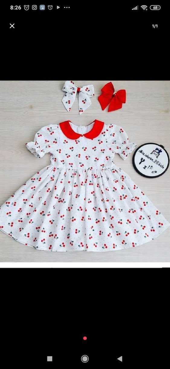 Kız çocukları için pamuklu, kısa kollu, renkli kiraz desenli elbise. Kırmızı yakalı ve fırfırlı detaylıdır. V yaka ve rahat kesimlidir. Saç tokalarıyla birlikte.