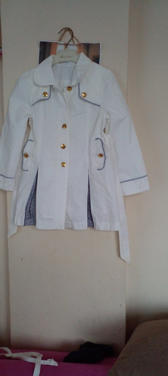 Kız çocukları için beyaz pamuklu ceket, düğmeli ve kesik yakalıdır. Ceplerde ve manşetlerde kontrast dikiş detayları bulunur.