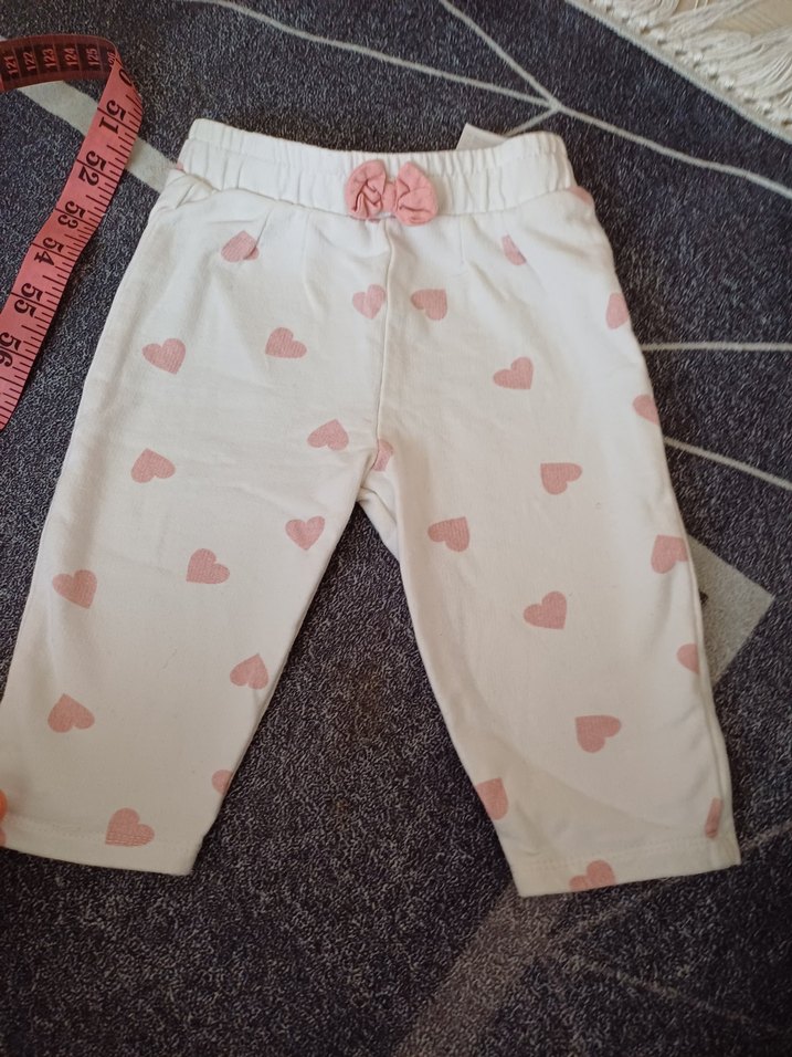 Pamuklu, bol kesim beyaz tayt, pastel pembe kalp desenli ve bel kısmında düğme detaylı, trend sokak stili için uygun.