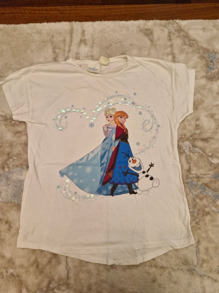 Kız çocuk beyaz pamuklu tişört, kısa kollu, yuvarlak yaka ve düğmeli detaylıdır. Pastel tonlarda Frozen karakter baskılı, rahat kesimdir. ❄️