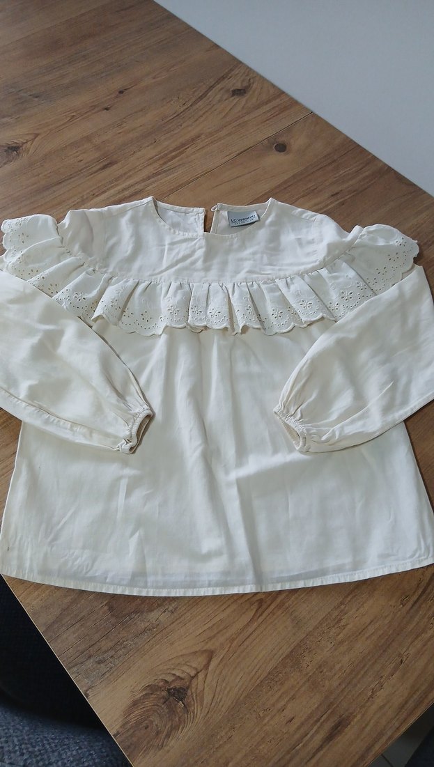 Beyaz pamuklu bluz, uzun kollu ve bol kesimdir. Göğüs kısmında nakışlı fırfırlar bulunur,tertemiz