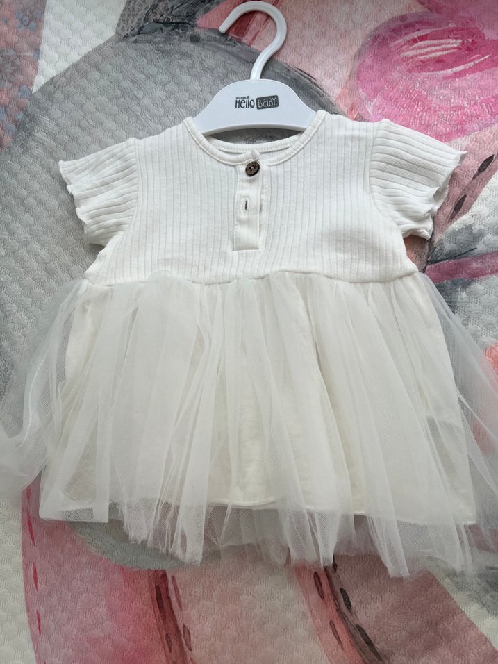 Kısa kollu, yuvarlak yakalı ve bol kesim kız çocuk elbisesi. Yumuşak pamuktan, bohem tarzda, beyaz pastel renkte fırfırlı etek detaylıdır.