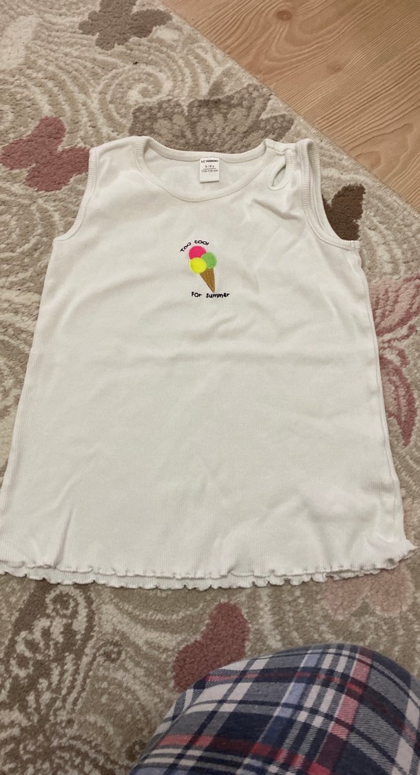 Kız çocukları için beyaz pamuklu kolsuz tişört, yuvarlak yaka ve bol kesimlidir. Pastel renkli dondurma baskısı ve fırfır detayları bulunur.