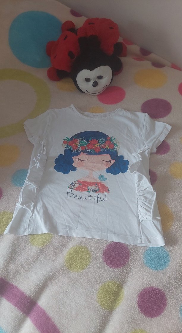 Kısa kollu, bol kesim beyaz pamuklu tişört. Önünde bohem tarzda baskı ve 'Beautiful' yazısı bulunur. Yuvarlak yakalı, yanlarda fırfır detaylı.