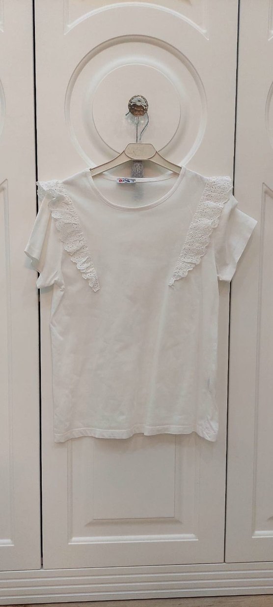 Pamuklu, kısa kollu, yuvarlak yaka ve bol kesim kız çocuk tişörtü. Ön kısmında nakışlı fırfır detayları bulunur, sade ve hafif bir sokak stili sunar. 10 yaş uyumlu