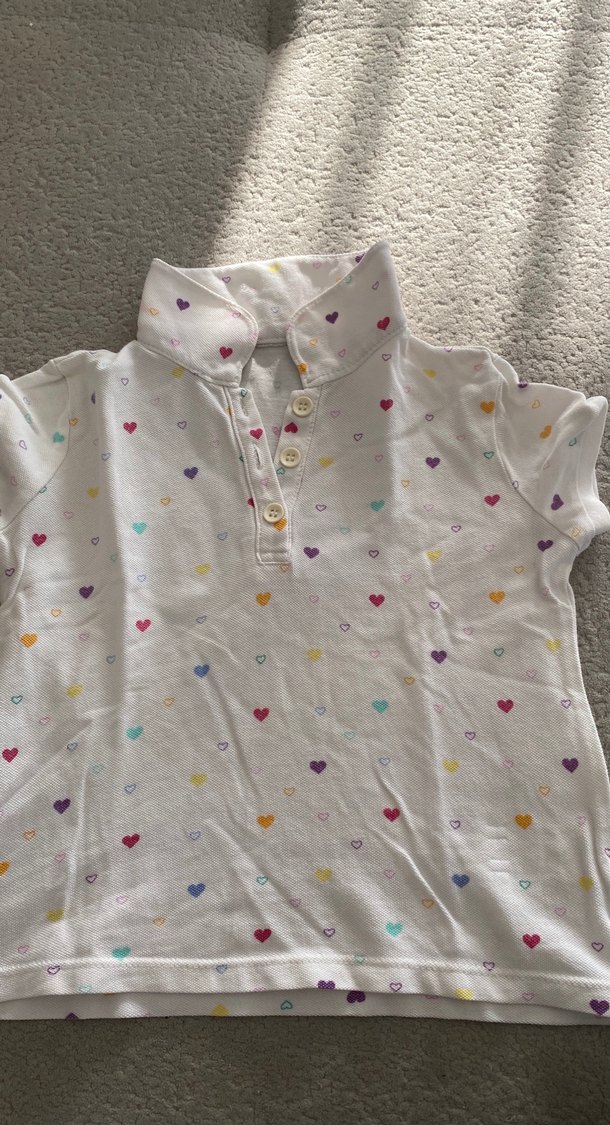 Pamuklu, kısa kollu, düğmeli ve yakalı bu kız çocuk gömleği, pastel renkli kalp desenleriyle trend sokak stilini yansıtıyor.