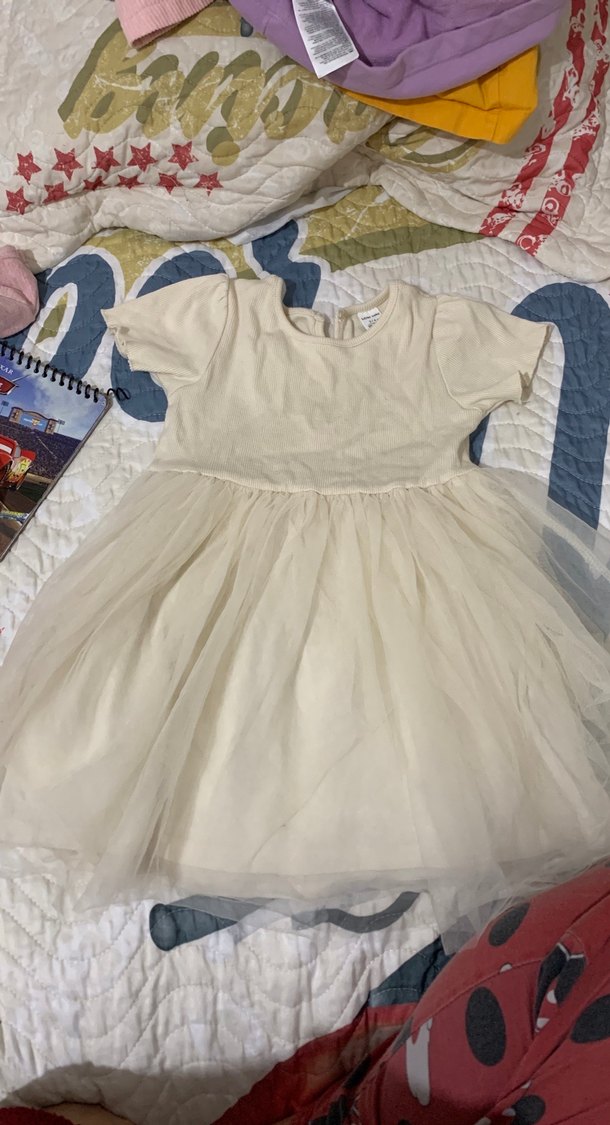 Kısa kollu, pamuklu kumaştan yapılmış, pastel beyaz renkli, katmanlı etekli, vücuda oturan kız çocuk elbisesi.