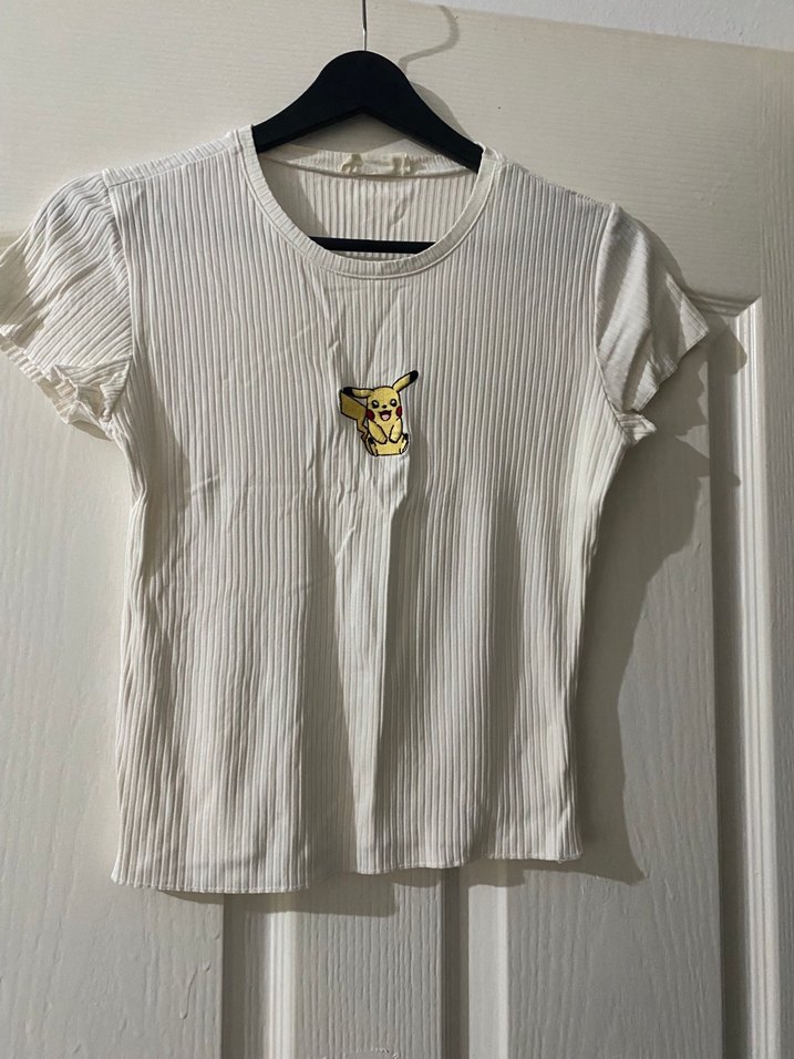 Kız çocukları için kısa kollu, yuvarlak yakalı ve pileli dokulu pamuklu tişört. Pastel beyaz renkte, üzerinde Pikachu baskısı bulunan, trend sokak tarzına uygun bir model.