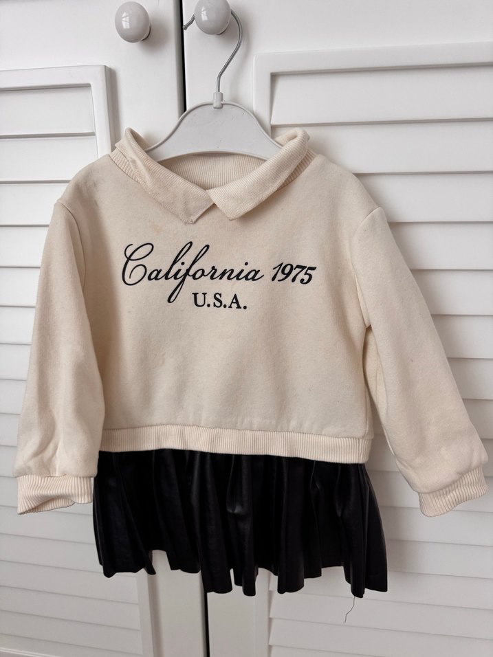 Uzun kollu, bol kesim ve bisiklet yaka kız çocuk beyaz pamuklu sweatshirt. "California 1975 U.S.A." baskılı ve fırfır detaylı, sokak stili için uygun.