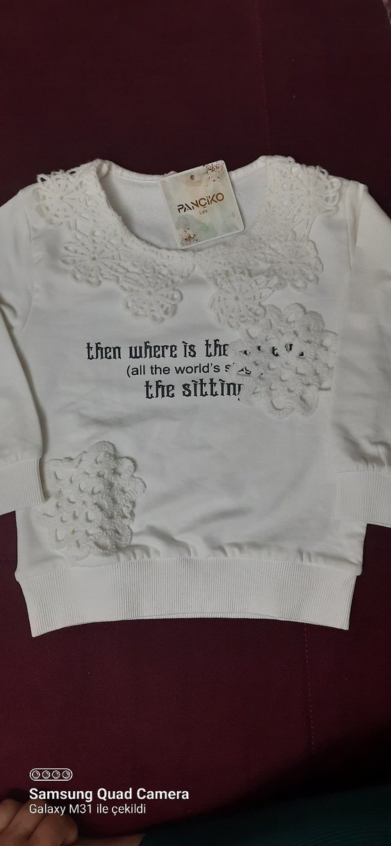 Uzun kollu, yuvarlak yaka, beyaz pamuklu kız çocuk sweatshirtü. Örme çiçek desenleri ve baskılı yazı detayları içerir. Rahat kesim, sokak stili için uygun.