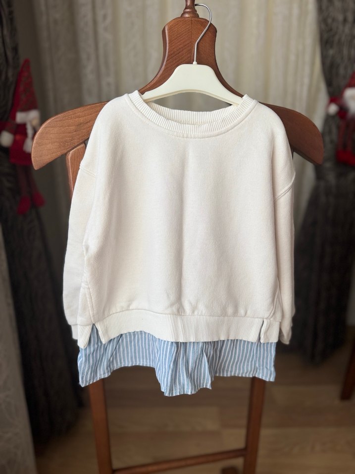 Pamuklu, uzun kollu, yuvarlak yaka, bol kesim kız çocuk sweatshirtü. Pastel beyaz renkte, gönlek detaylı sweatshirt. Zara marka 3-4 yaş.