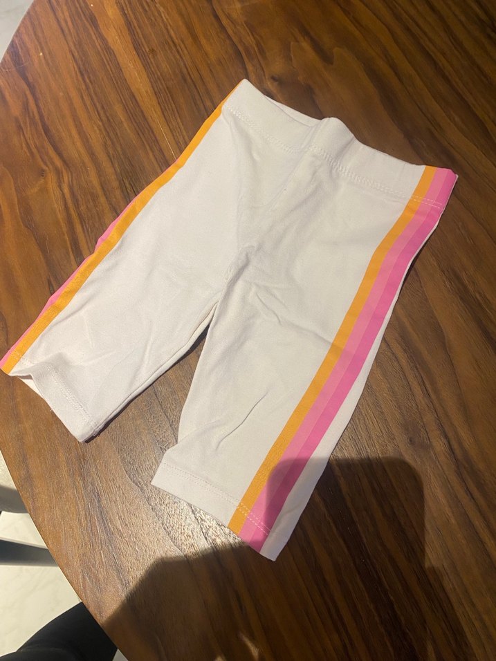 Pamuklu beyaz kumaştan, yanları pastel pembe ve turuncu şeritli, elastik bel bantlı kız çocuk taytı.