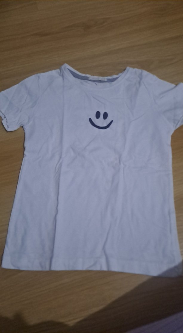 Beyaz pamuklu kız çocuk tişörtü, kısa kollu ve yuvarlak yakalıdır. Baskılı gülümseyen yüz deseniyle rahat ve şık bir görünüm sağlar.