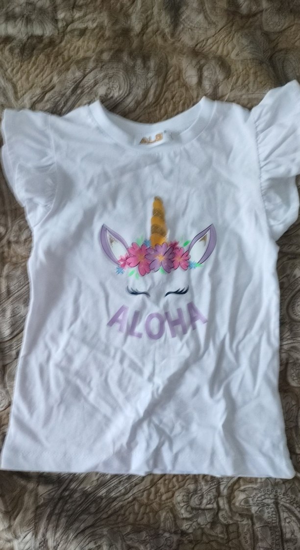 Kız çocukları için pamuklu, beyaz, bol kesim tişört. Kısa fırfırlı kollu, pastel renklerde unicorn baskılı, yuvarlak yaka, sokak tarzı tişört. hiç giyilmedi
