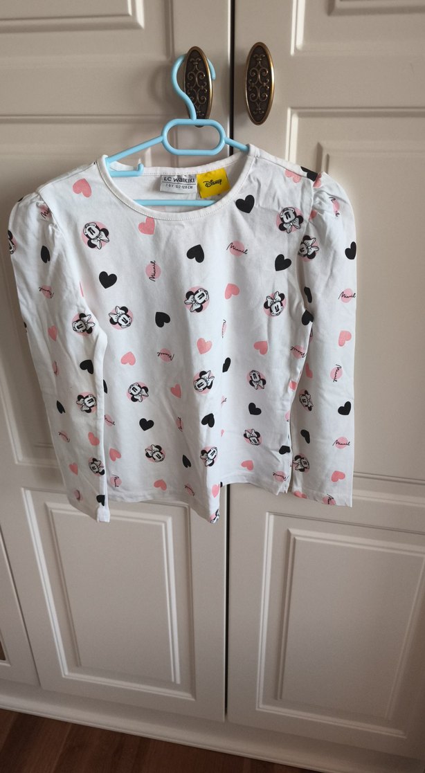Beyaz pamuklu, uzun kollu ve bol kesim kız çocuk tişörtü. Düğme detaylı, kalp ve çizgi film yüzleri baskılı, rahat ve şık bir model.