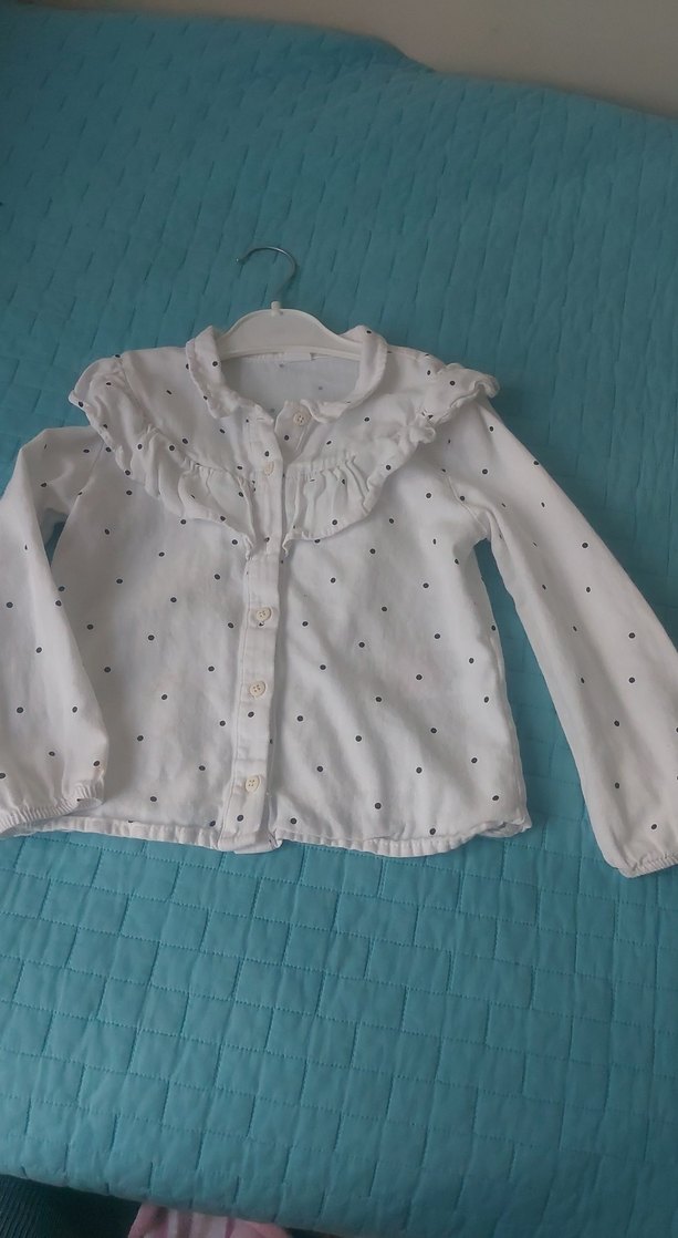 Pamuklu, kız çocuk gömleği, uzun kollu, yakalı ve düğmeli. beyaz renkte, küçük baskılı ve fırfır detaylı, trend sokak stili için uygun. çok az kulanildi yeni ve temiz ürün