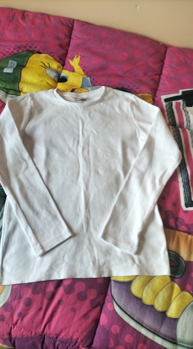 Beyaz kız çocuk tişörtü, uzun kollu ve yuvarlak yakalıdır. Pamuklu, rahat ve bol kesimdir, sokak tarzına uygundur. yeni sadece etiketi yok