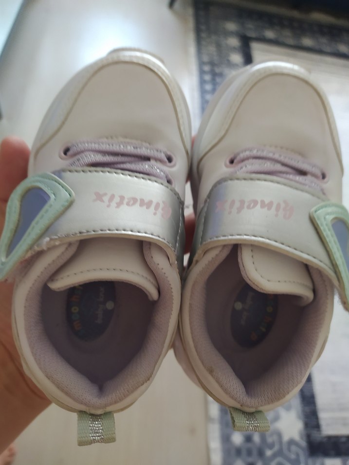 Beyaz kız çocuk spor ayakkabısı, pastel desenli, lastik tabanlı ve kolay giyilen cırt cırtlı bantlıdır. Trendy casual street wear tarzında.