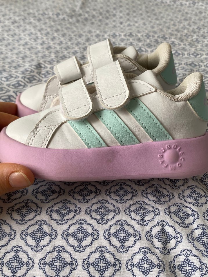Beyaz ve pastel yeşil çizgili, pembe tabanlı kız çocuk spor ayakkabısı. Kolay kullanım için cırt cırtlı bantlar bulunur.