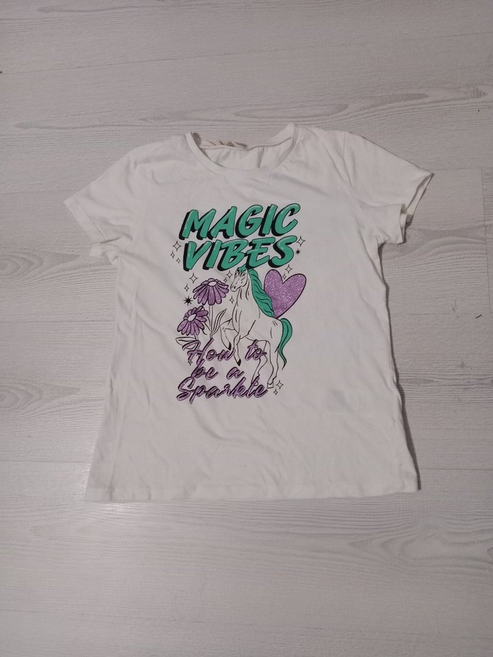 Beyaz renkli kız çocuk tişörtü, kısa kollu ve yuvarlak yaka. Pastel baskılı, payet detaylı ve pamuklu kumaştan üretilmiştir. 11 -12 yaş diyor ama bedeni dar bu sene alındı çok giyilmedi .temiz