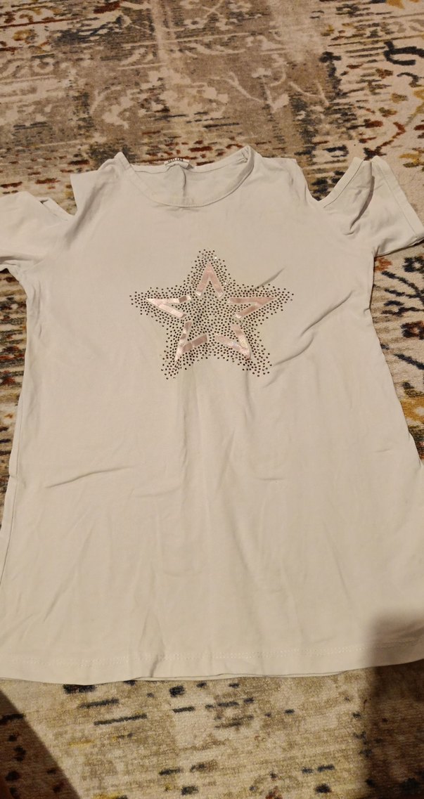 Kısa kollu, yuvarlak yakalı kız çocuk tişörtü, bol kesim ve payetli yıldız baskısı ile yumuşak sentetik kumaştan yapılmıştır.