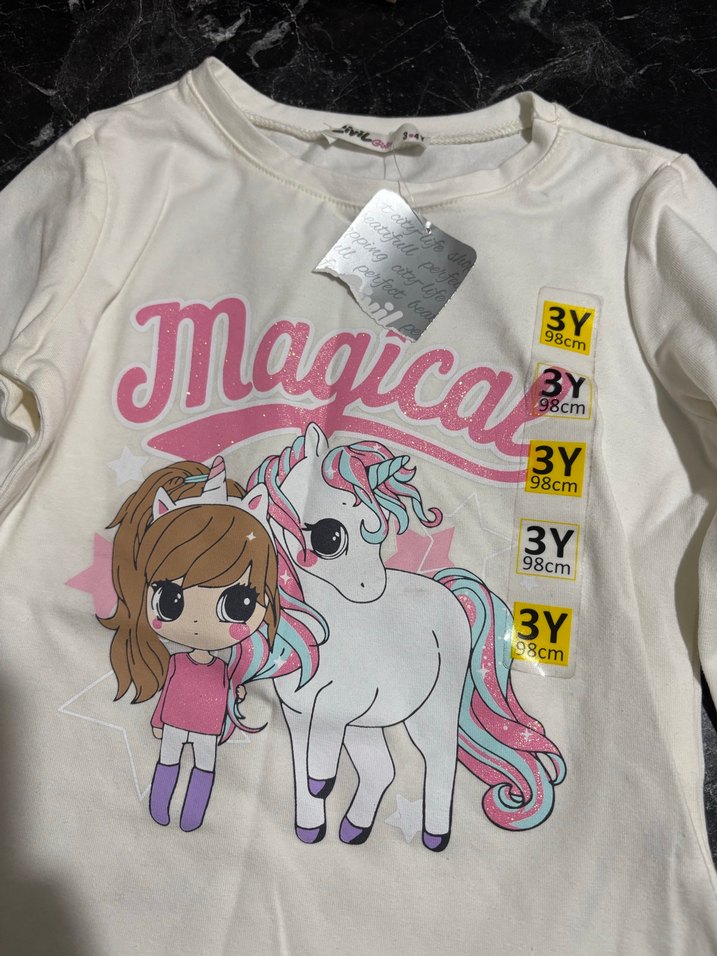 Beyaz, uzun kollu, payetli baskılı kız çocuk tişörtü. Sentetik kumaştan, dar kesim ve bisiklet yakalı. 3 yaş (98 cm) beden.