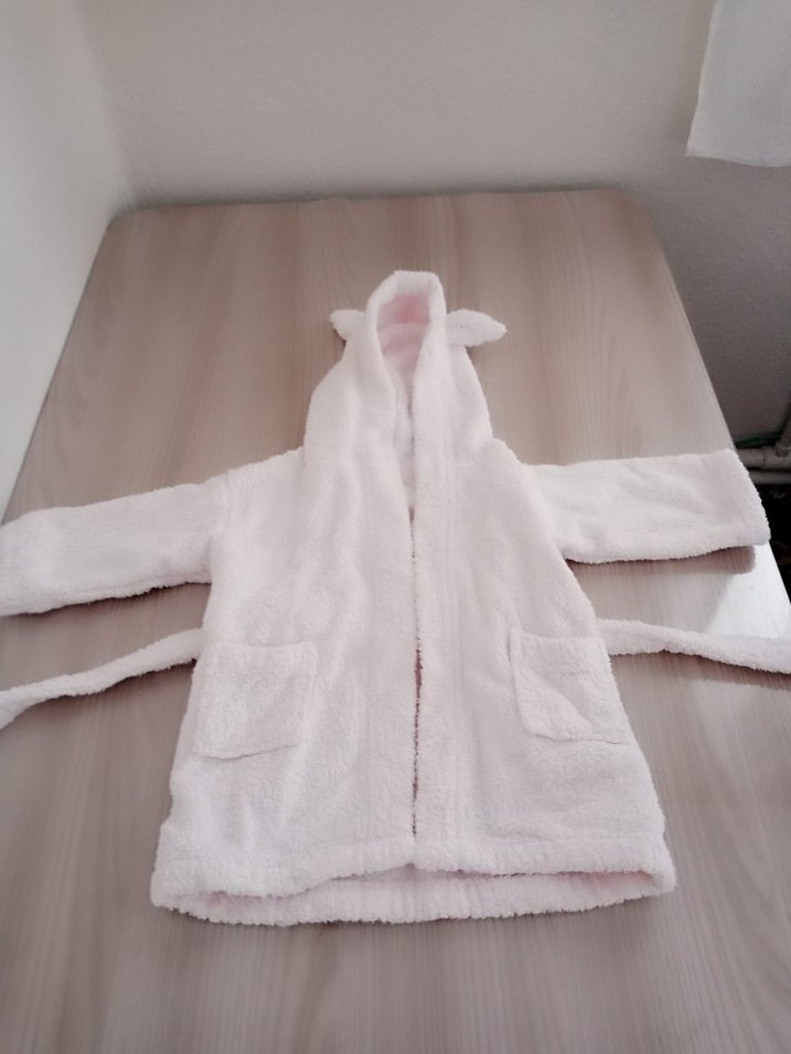 Kız çocukları için kapüşonlu ve cepli, yumuşak ve sıcak peluş kumaştan beyaz bornoz. Pastel tonlarda ve kuşaklıdır.