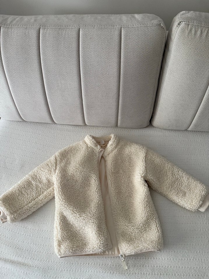 Kız çocuk için yumuşak ve sıcak kumaştan, bol kesim, bisiklet yaka, beyaz peluş ceket. Kürk detaylı, sade ve desensiz tasarım.