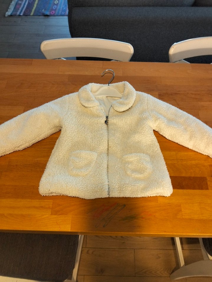 Bu beyaz peluş kız çocuk ceketi, notched lapel yaka ve kürk detaylarıyla gevşek kesimdedir. İki ön cepli, fermuarlı ve desensiz tasarıma sahiptir. ❄️