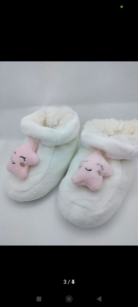 Kız çocukları için beyaz, yumuşak peluş kumaş ve kürk detaylı ev terliği. Pastel pembe nakışlı yıldız süslemeleri ile sade bir tasarım.