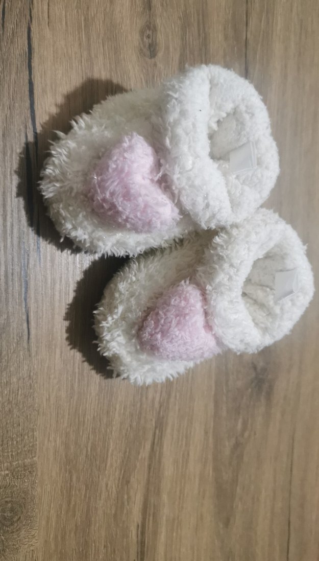 Beyaz peluş, yumuşak tüylü ve nakışlı pembe kalp detaylı kız çocuk ev terliği, sıcak tutar.