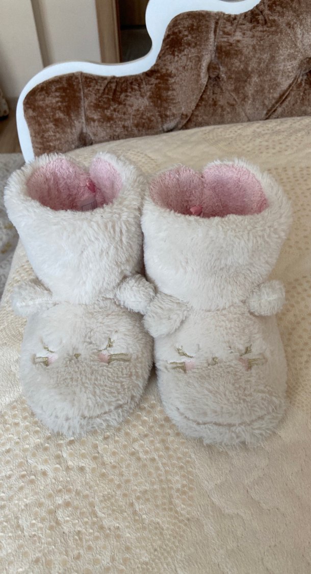Kız çocukları için beyaz peluş ve nakış detaylı, içi yumuşak kumaşla kaplı sıcak ev terliği.