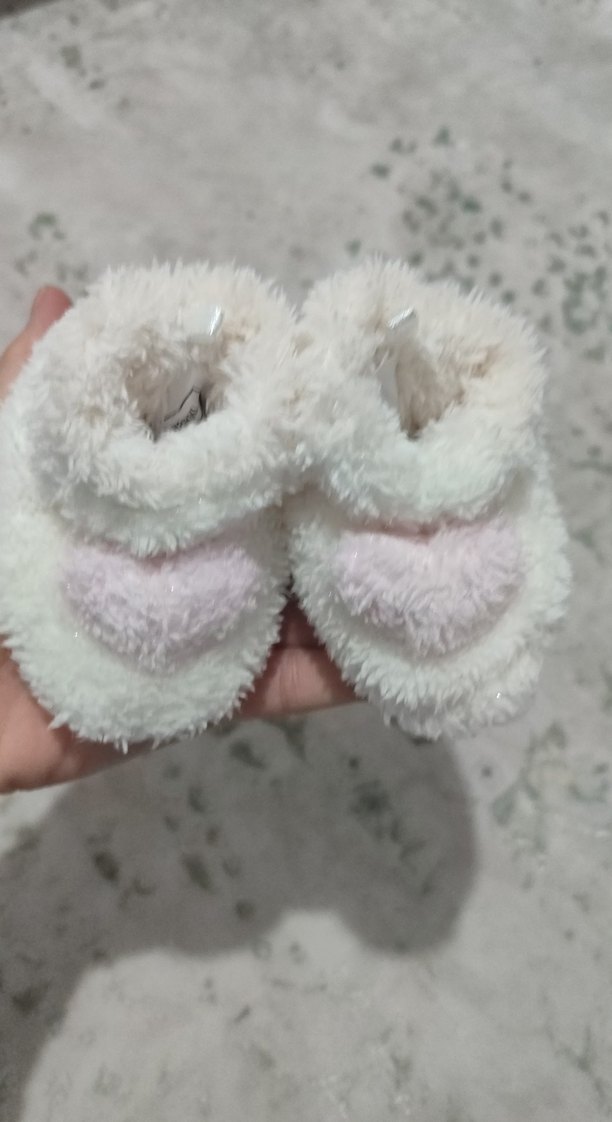 Kız çocukları için beyaz, yumuşak kürk detaylı ve pastel pembe kalp desenli sıcak terlikler. hiç giyilmedi yeni doğan için uygun 16 numara