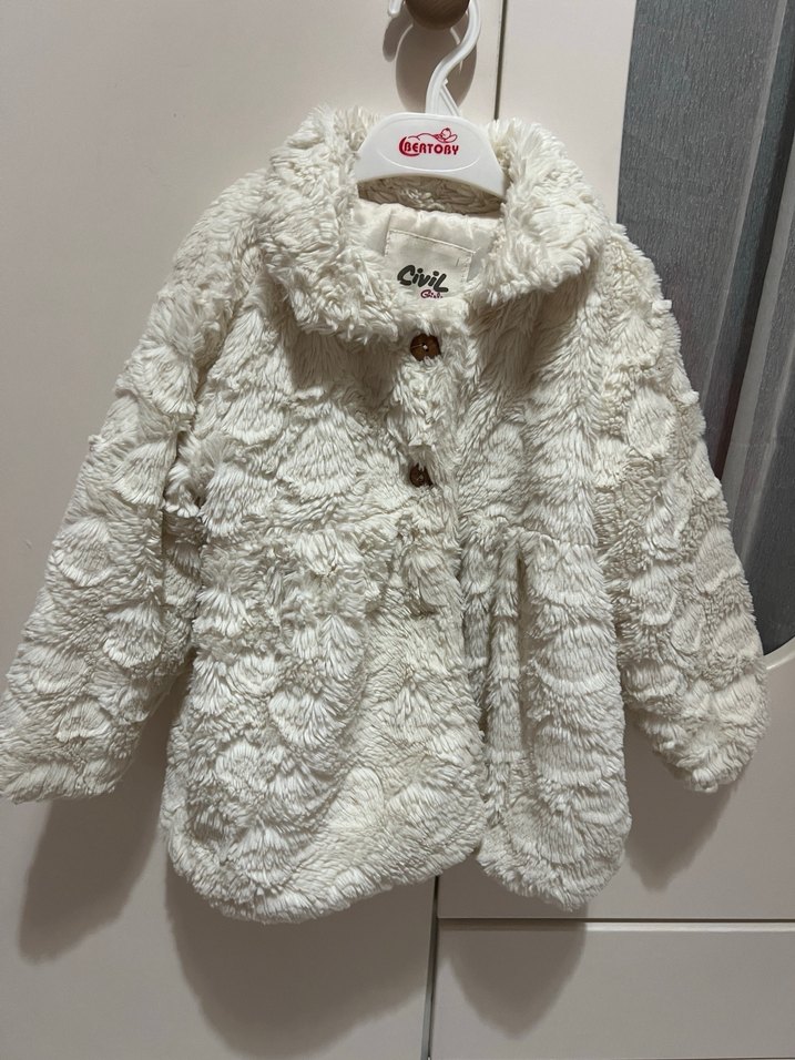 Kız çocukları için krem renkte, peluş kumaştan yapılmış, kürklü detaylı, nakışlı ve geniş kesim ceket. 4-5 yaş İçi astarlı tertemiz yumuşacık ince mont