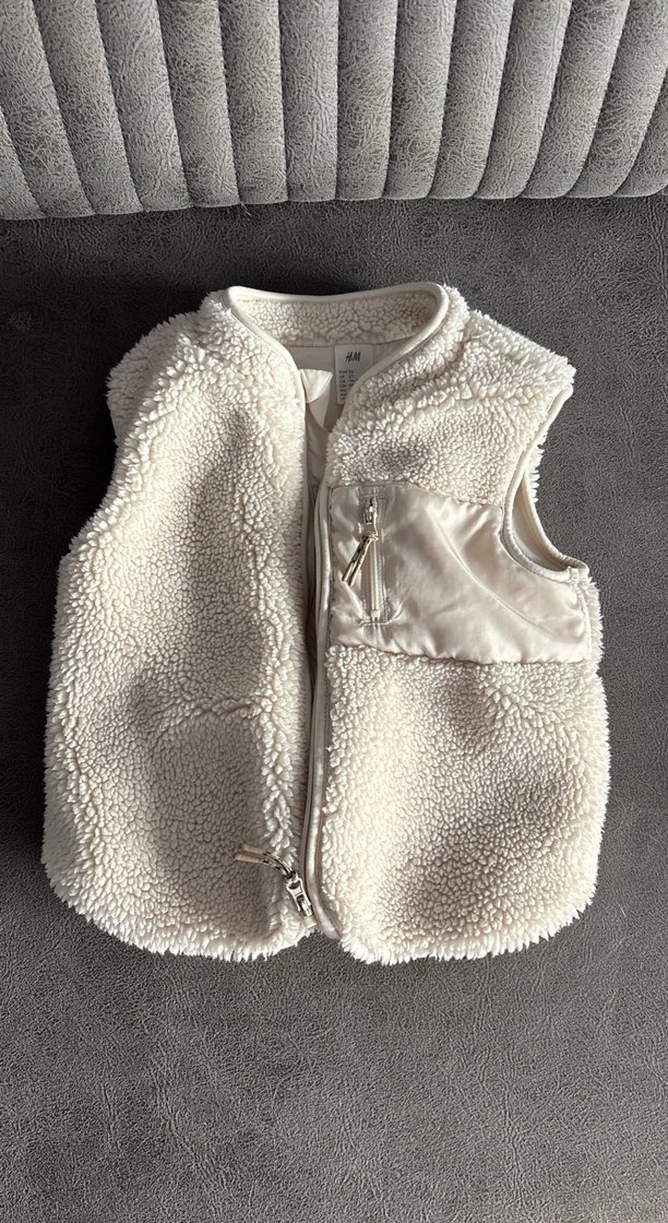 Kız çocukları için yüksek yakalı, kolsuz, yumuşak peluş detaylı ve pastel beyaz renkte, dar kesim yelek. Sokak modasına uygun.