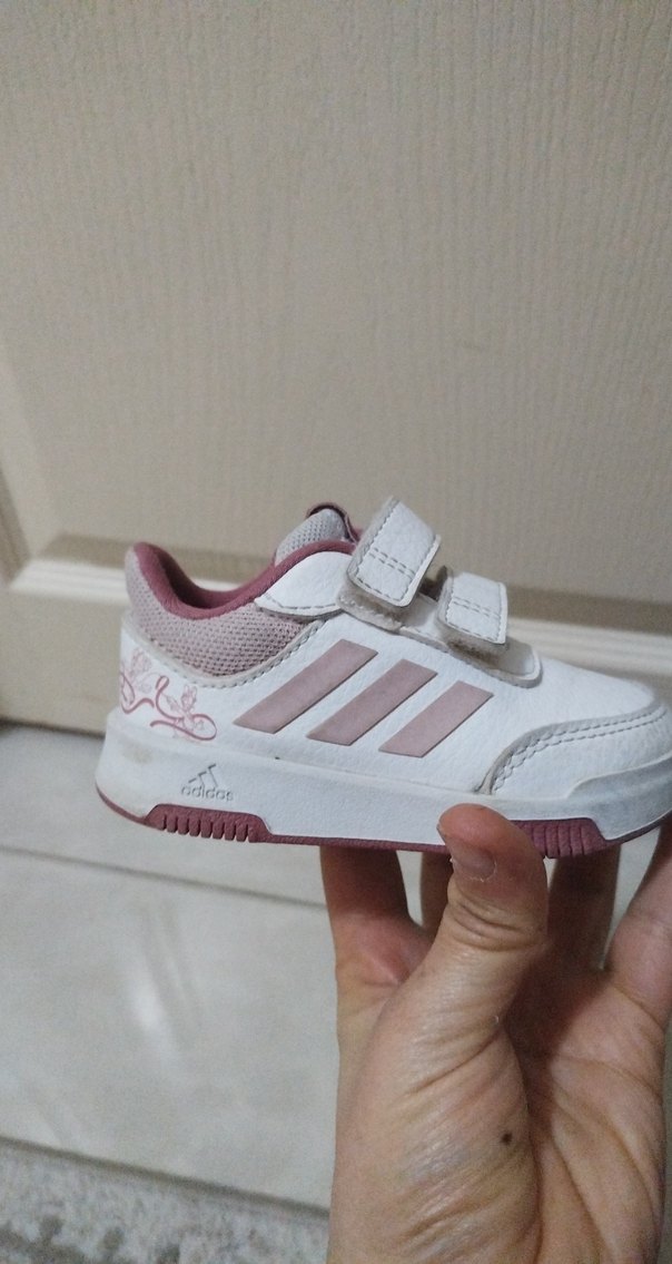 Beyaz ve açık pembe renkli, baskılı detaylara sahip kız çocuk spor ayakkabısı. Kauçuk tabanlı ve cırt cırtlı, sokak stiline uygun orjinaldir sayili giyildi.