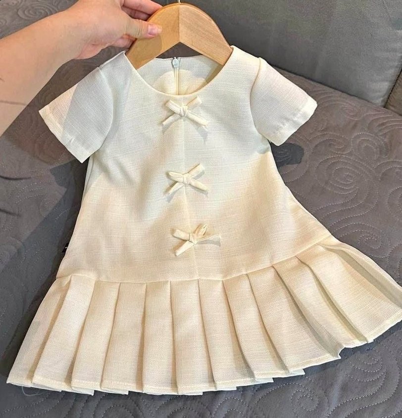 Kız çocuklar için yuvarlak yaka, kısa kollu, pilili etekli klasik kesim elbise. Yumuşak sentetik kumaştan, pastel beyaz renkte, önünde üç küçük fiyonk bulunur.