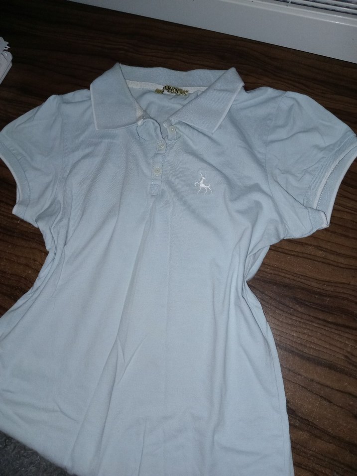 Pamuk kumaştan yapılmış, düğmeli yakalı ve kısa kollu, bebek mavisi renkli polo tişörtü. Sokak stili için uygun, sade ve şık tasarım. ️ dar kalıp